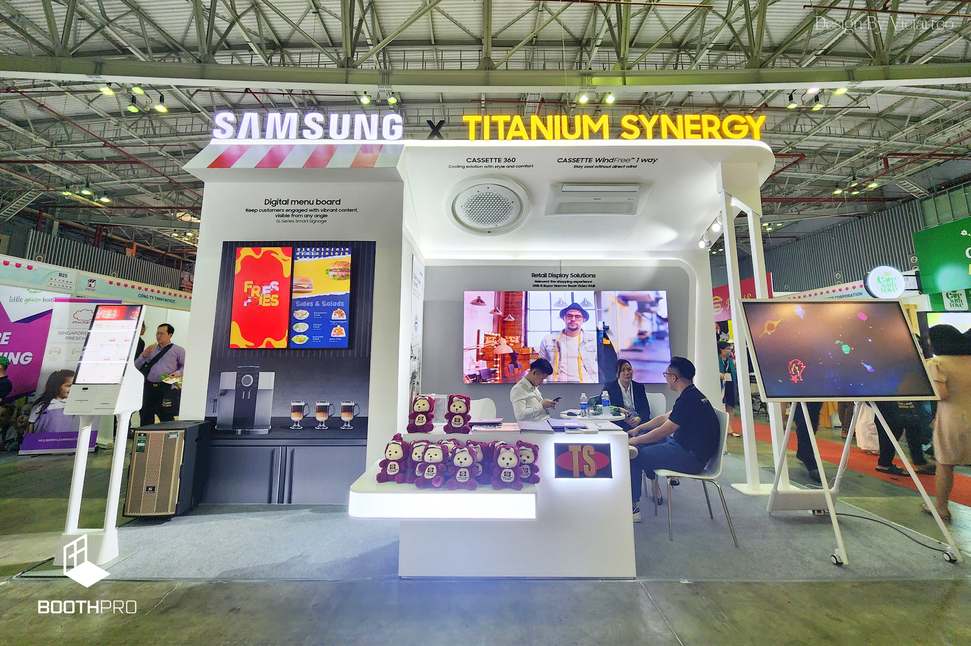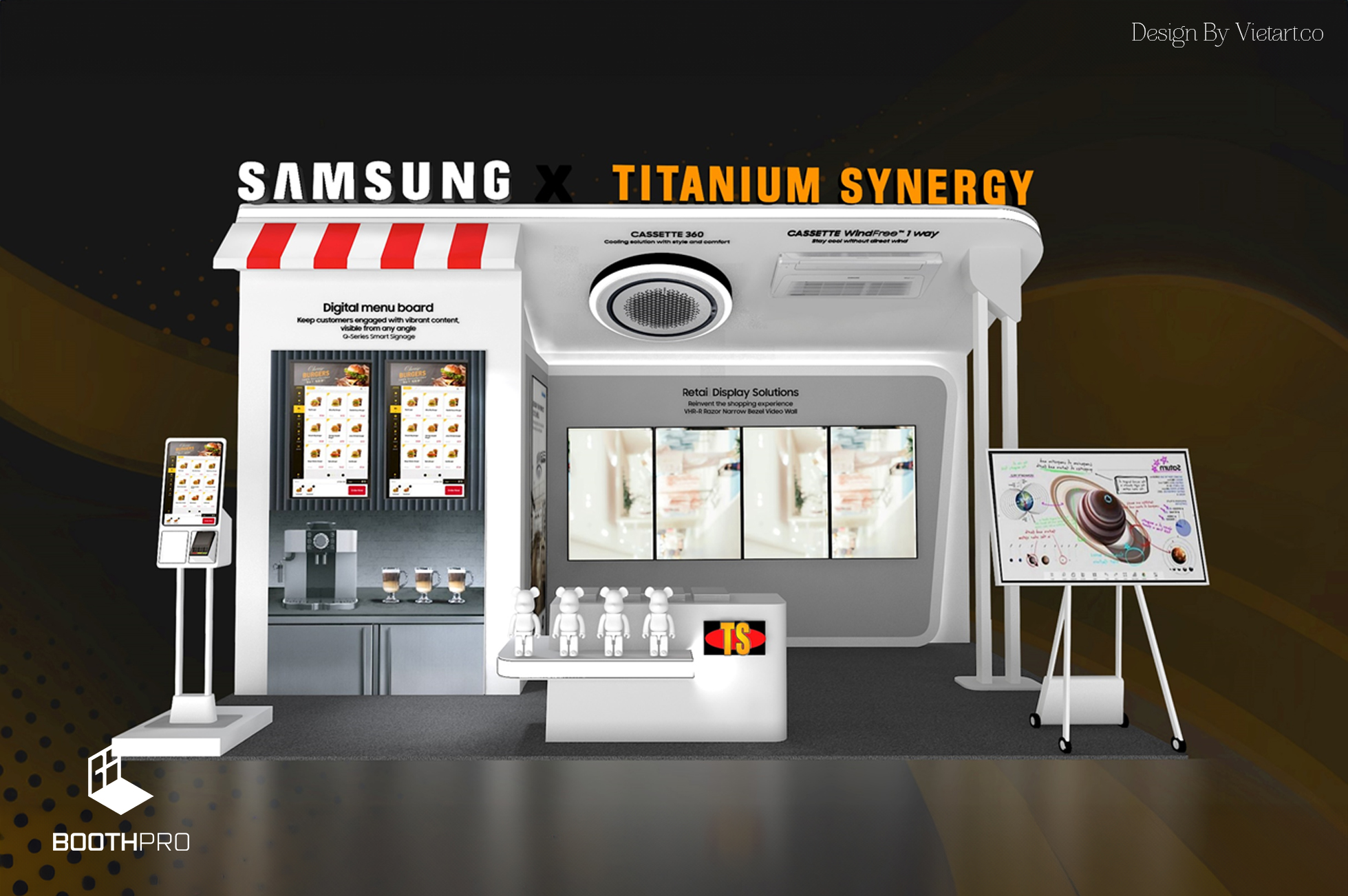 Thiết kế tổng thể của gian hàng Samsung x Titanimu Synergy mang phong cách tinh tế và mềm mại. Với màu trắng làm màu chủ đạo, chúng tôi tạo ra một không gian sáng sủa, tinh khiết và thanh lịch. Màu trắng tạo cảm giác tươi mới và thể hiện sự sạch sẽ, trong khi còn mang đến vẻ đẹp tinh tế, mềm mại cho gian hàng.