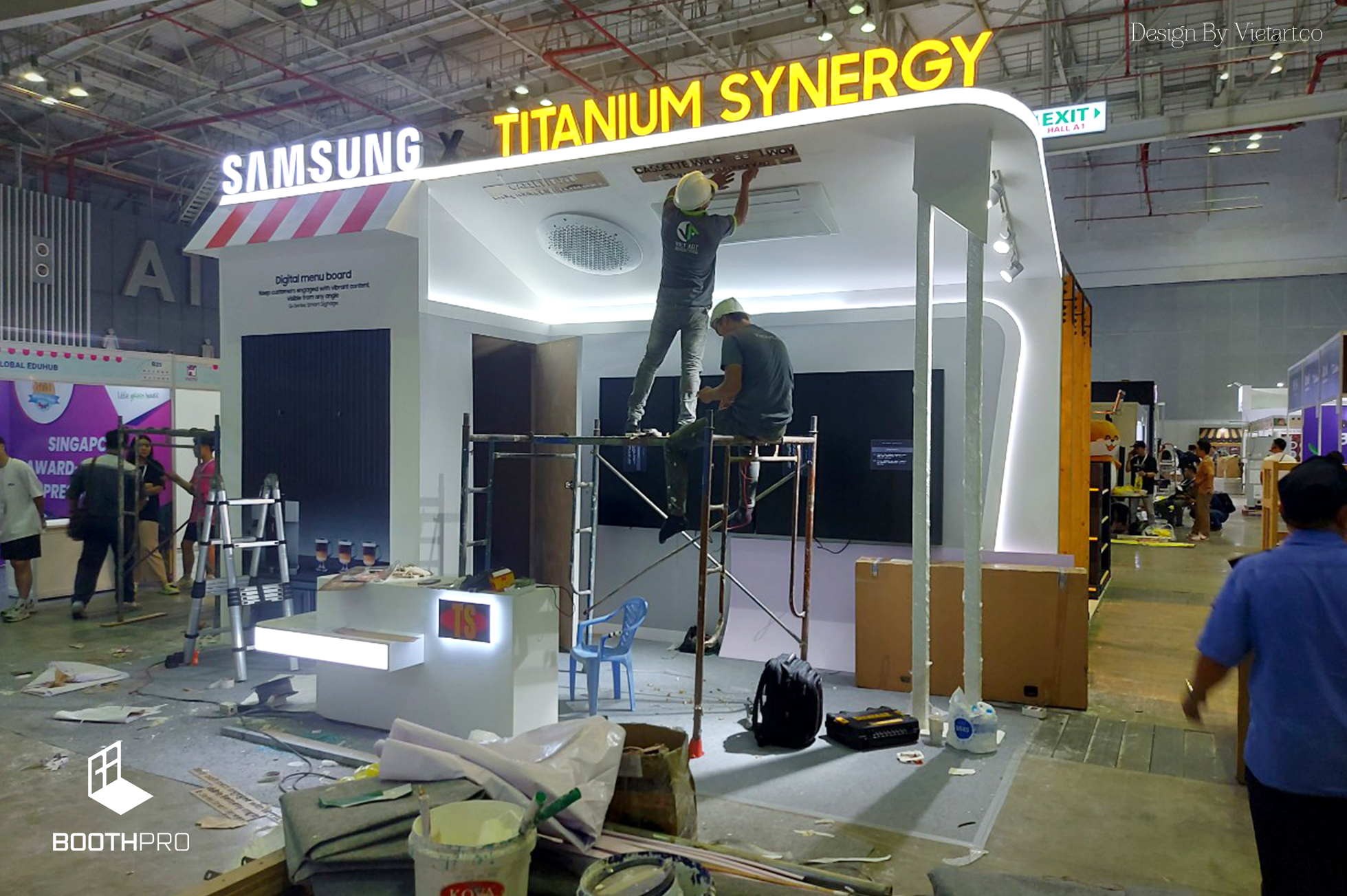 Ánh sáng trong gian hàng Samsung x Titanimu Synergy được thiết kế để chiếu sáng rõ ràng và nổi bật gian hàng. Ánh sáng trắng sáng giúp làm nổi bật từng chi tiết và sản phẩm, tăng cường sự tinh tế và chất lượng của chúng. Sự kết hợp giữa ánh sáng và màu trắng tạo nên một không gian rực rỡ và hấp dẫn.
