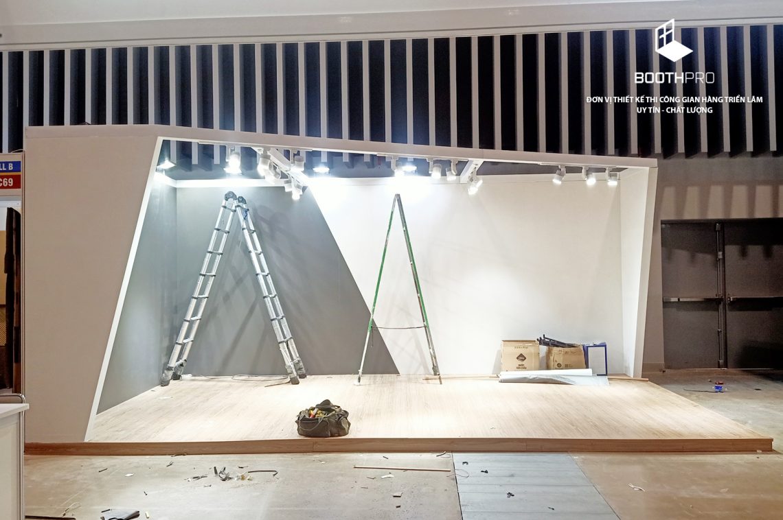 Quá trình lắp đặt booth triển lãm bắt đầu với việc xây dựng cấu trúc. Đội ngũ lắp đặt sẽ tiến hành lắp ráp những khung kết cấu đã được sản xuất trước đó theo thiết kế. Việc này bao gồm việc lắp ghép, gắn kết và kiểm tra tính ổn định và an toàn của cấu trúc. Đảm bảo rằng booth có một cấu trúc chắc chắn và ổn định là điều hết sức quan trọng để đảm bảo an toàn cho khách hàng tham quan triển lãm.
